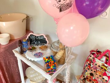 A small theme party for just about anything. Slumber party, celebration or a weekend of fun! This also can be added to a birthday party for an additional element of entertainment. No additional set up/amenities provided. POP-UP PARTIES ARE STATIONS, NOT FULL PARTY SET-UP. Includes rectangular tables with activity and glam seats for participating guest.